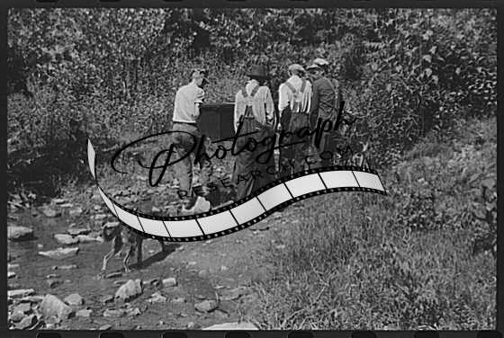Title: Mountain people carrying a homemade coffin up creek bed to the family plot on the hillside where it will be buried. This section is too isolated to hold any formal funeral services immediately. Up South Fork of the Kentucky River near Jackson, Kentucky
