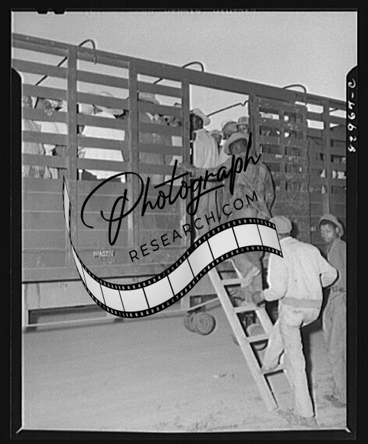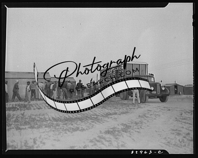 Title: Bridgeton, New Jersey. FSA (Farm Security Administration) agricultural workers' camp. Farmers send their trucks at dawn to the migrant camp to carry pickers to the field