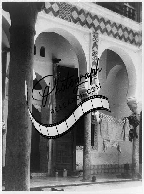 Laundry hanging between Moorish arches,cloth,chores,decoration,North Africa,1930