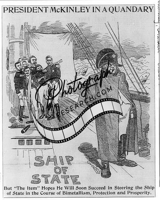 President McKinley in a Quandary,1897?,cartoon,ship,sea