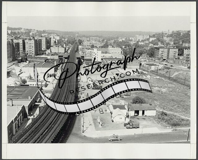 Photograph shows aerial view of Broadway from W 212th St. looking towards Fort Tryon Park and the Met Cloisters in the distance.