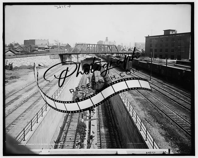 Approach Detroit River Tunnel,railroads,trains,buildings,Michigan,MI,c1910