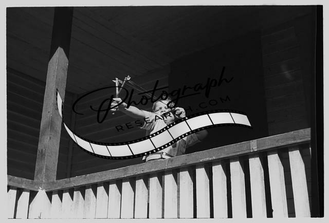 Title: Mountain child shooting slingshot from porch of his home. Near Buckhorn, Kentucky