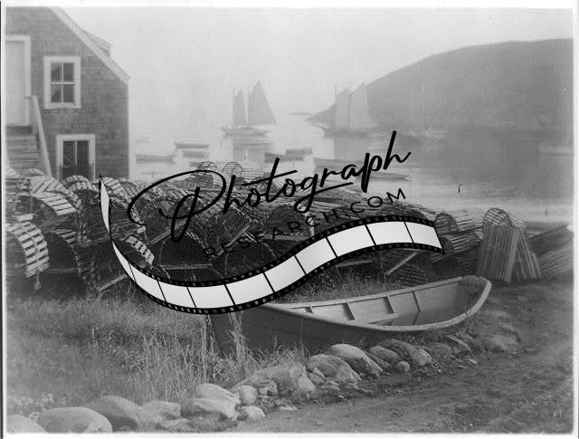 Drying the sails,c1915,lobster traps stacked together,Gardiner,Maine,ME,boats