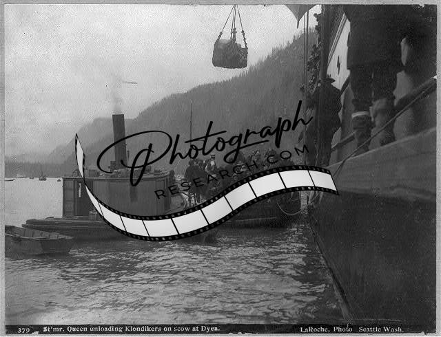 Steamer,QUEEN,unloading Klondikers on scow at Dyea,1897