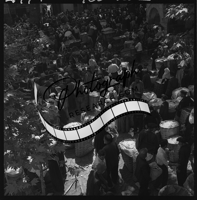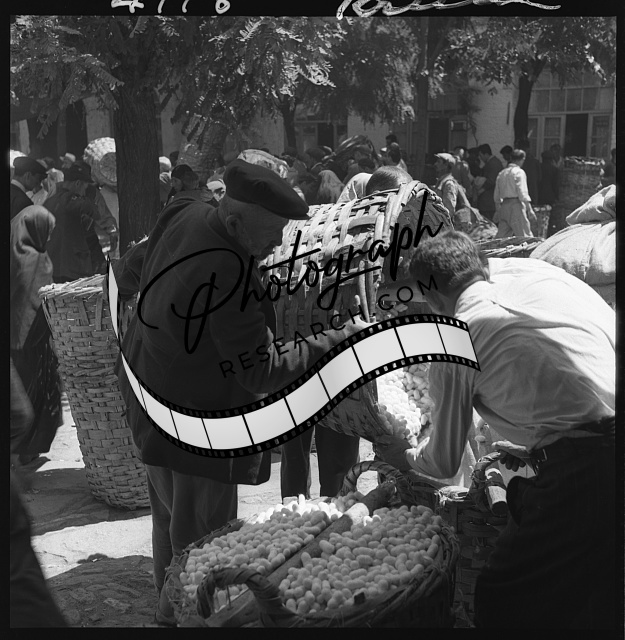 Summary: Photograph shows a man filling a tin with silkworm cocoons, Bursa, Turkey.