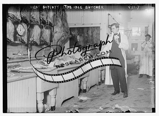 Butcher stands idle before his counter of meat during the meat boycott,1910