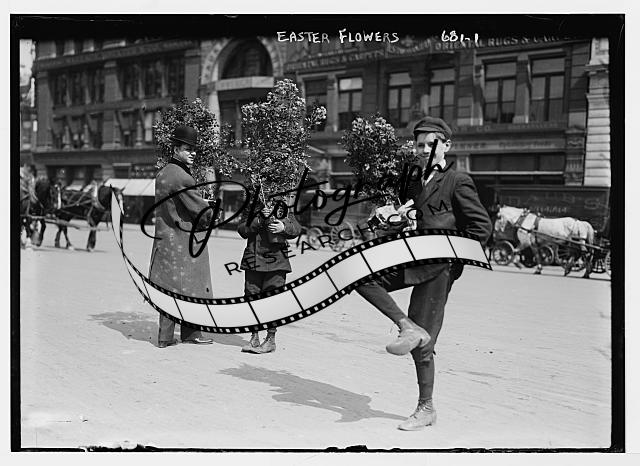 Men holding Easter flowers,New York,NY,Boy smiling,holding flowers,horses