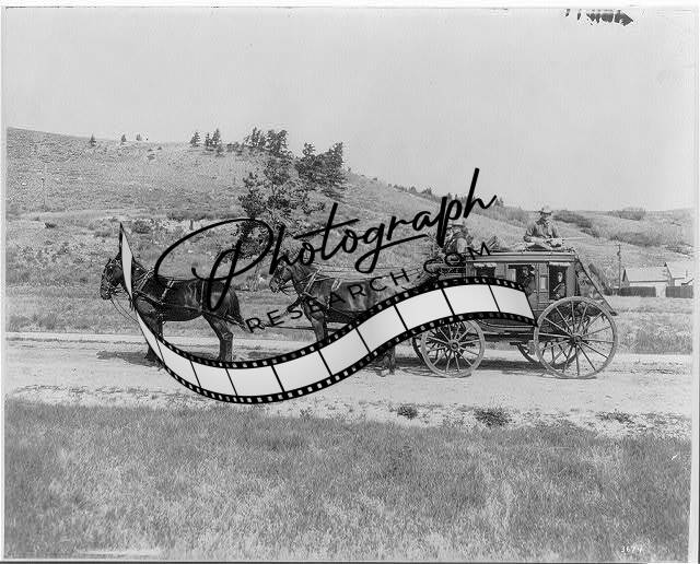 Old stage coach with passengers and armed guns,c1913,horse-drawn,fields