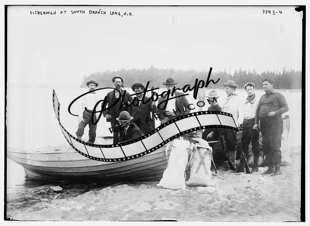 Fishermen at South Branch Lake,N.B.,New Brunswick,boats,guns,shoreline
