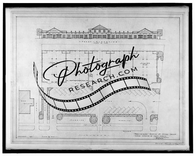 Shopping center and parking lot ("store group") for Thos. J. Fisher & Co., Connecticut Avenue and Idaho Avenue, N.W., Washington, D.C. Front elevation, plan, and site plan