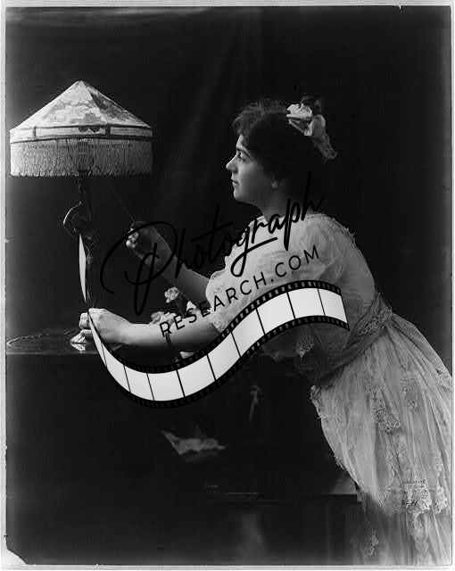 Has a pull,woman pulling chain on lamp,c1908,white dress,lamp shade