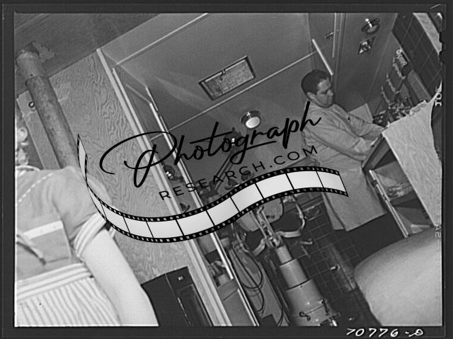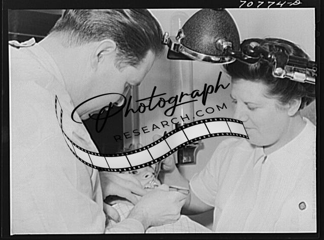 Title: FSA (Farm Security Administration) dentist and migrant child in the FSA dental trailer at the FSA camp for farm families. At Caldwell, Idaho