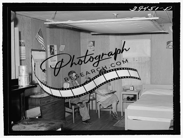 Title: Migratory farm worker, his wife and daughter in shelter at the FSA (Farm Security Administration) labor camp. Caldwell, Idaho. The housing for migratory workers is row shelters