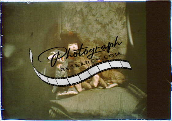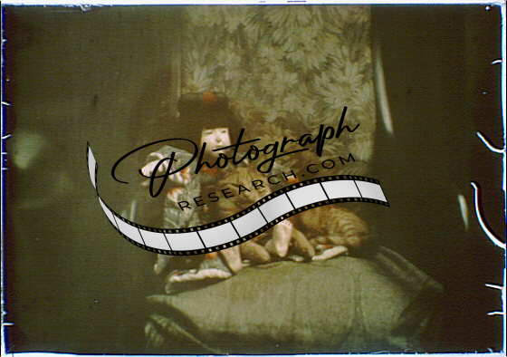 Buzzer,cat lying,chair,doll,animals,pets,autochromes,color,Arnold Genthe,1911