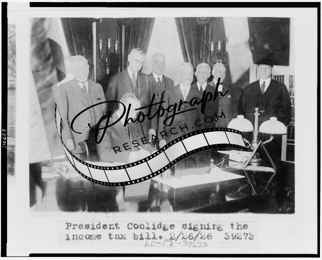 Calvin Coolidge signing income tax bill,desks,Andrew Mellon,Herbert M Lord,1926