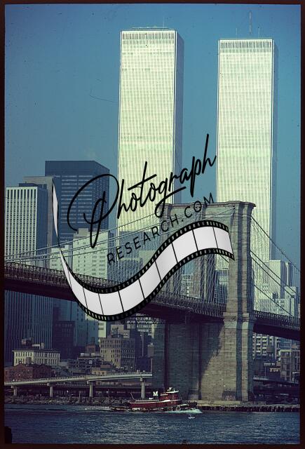 [[World Trade Center, New York, New York. Exterior. Brooklyn Bridge in foreground