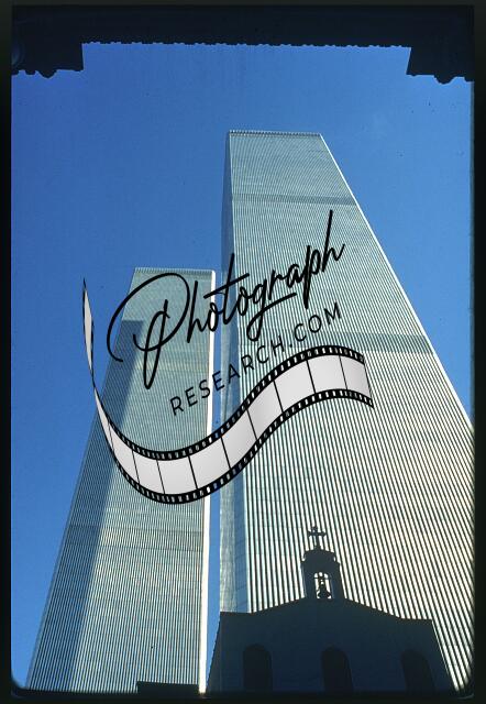 [[World Trade Center, New York, New York. Exterior. View from below with St. Nich