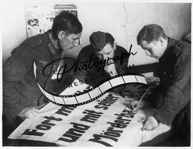 German war prisoners in Russia painting poster in protest of mistreatment of Russian war prisoners by Germans. Sign reads "Down with Hitler and his band of murders"