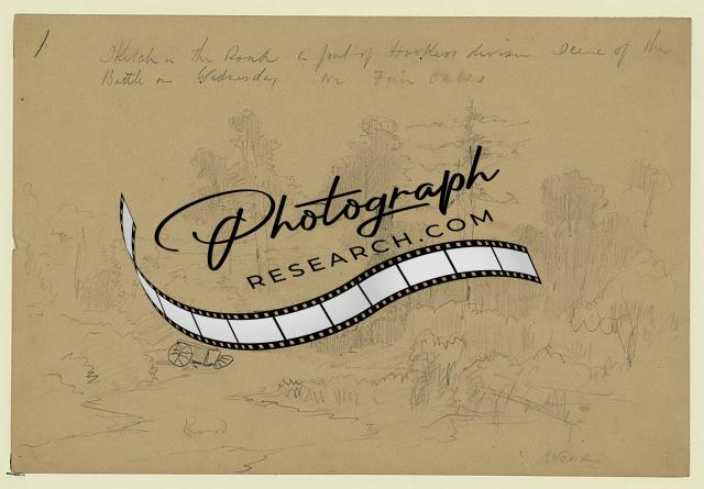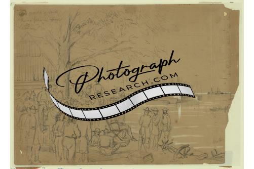 Summary: Ink sketch within oval border of Federal encampment with numerous tents, trees and a flagpole with the Union flag.