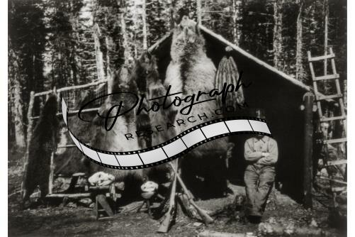 Hunting camp,Copper River,Alaska,AK,5 bearskins hanging,rifles,shelter,man