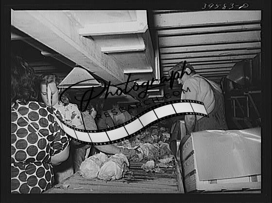 Title: In the lettuce packing plant. Canyon County, Idaho. Notice various labels for lettuce on wall in background