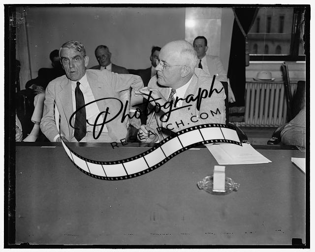 Title: Labor chief draws crowd at Capitol hearing. Washington, D.C. June 7. The appearance of John L. Lewis, C.I.O. Chief, before the Senate and House Labor Committees today drew a packed house at the hearing today. Lewis is shown at the right as he began his testimony in which he endorses the Black-Connery Bill. 6/7/37
