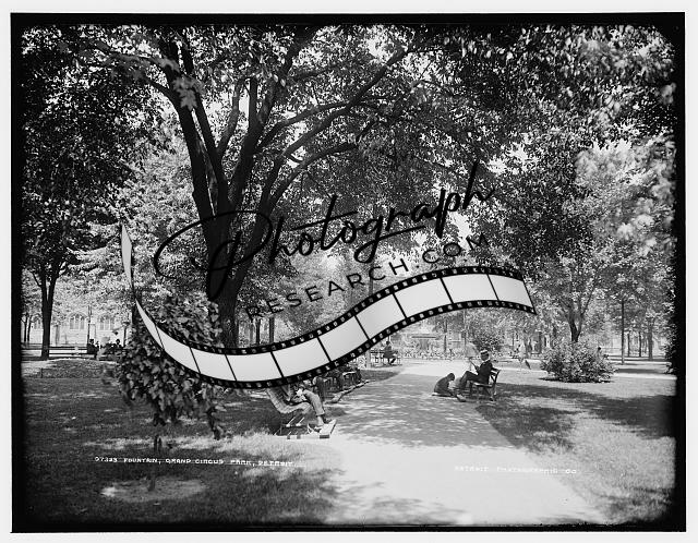 Fountain,paths,trails,statues,benches,Grand Circus Park,Detroit,Michigan,MI,1880