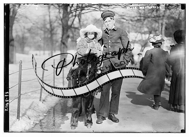 Alice Whitehouse,child,little girl,horseback,man,Bain news Service,snow