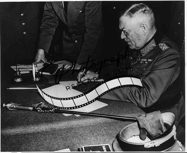 Field Marshall Wilhelm Keitel, signing the ratified surrender terms for the German army at Russian headquarters in Berlin