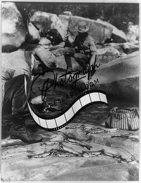 A nice catch,one man cleaning trout? on rock,other man netting trout,c1907