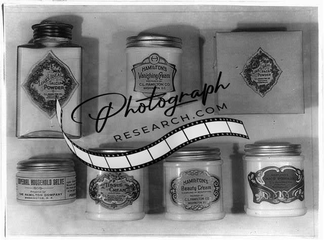 Talcum powder,household salve,face creams,hair pomade,bottle,CL Hamilton Co,1921