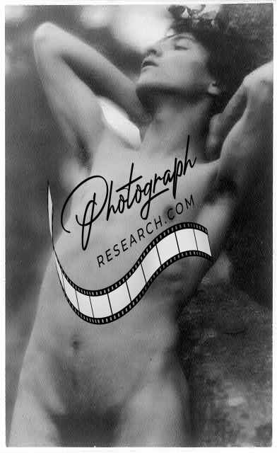 Nude youth with laurel wreath against rock with hands behind neck, cropped at thighs, Day, F. Holland (Fred Holland), 1864-1933, photographer