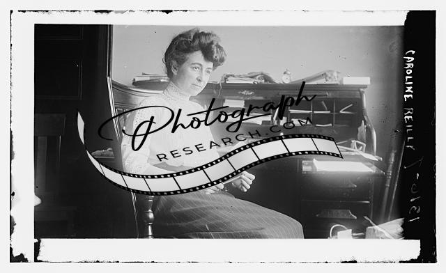 Caroline Reilly,woman seated at desk,holding pen,Bain News Service