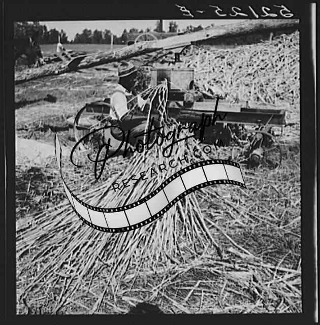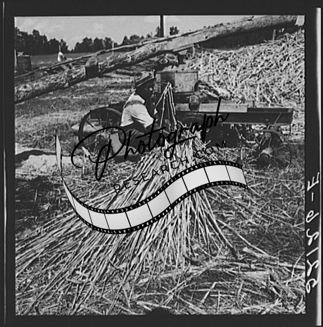 Title: A portable cane mill (the owner gets every sixth gallon for making the sorghum syrup). This is on the property of a Negro owner, Wes Chris, a tobacco farm of about 165 acres in a prosperous Negro settlement near Carr, Orange County, North Carolina. They are straining it into a barred, measured by a gallon can