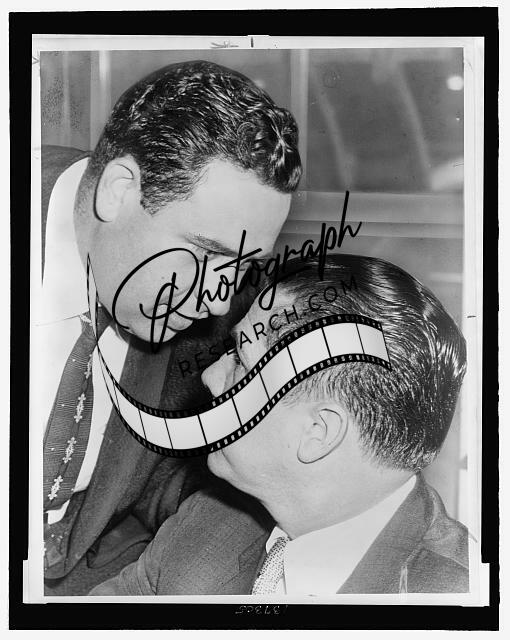 Bernard Spindel whispers in ear of James R. Hoffa after court session,1957