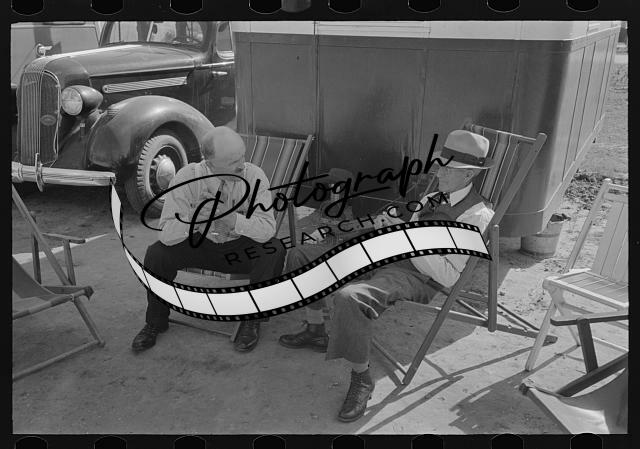 Tourists traveling in trailers talking in camp,McAllen,Texas,TX,FSA,1939,1
