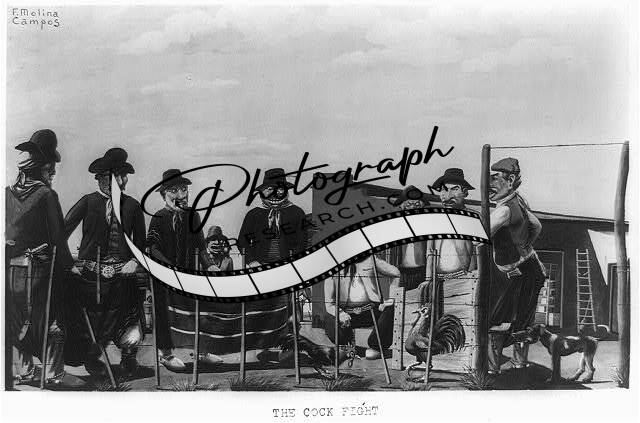 Cock fight,gauchos,watching,ring,dogs,roosters,Argentina,F Molina Campos,c1949