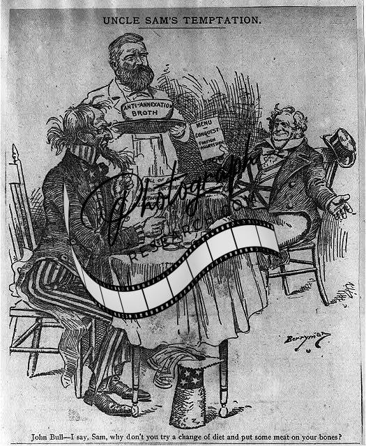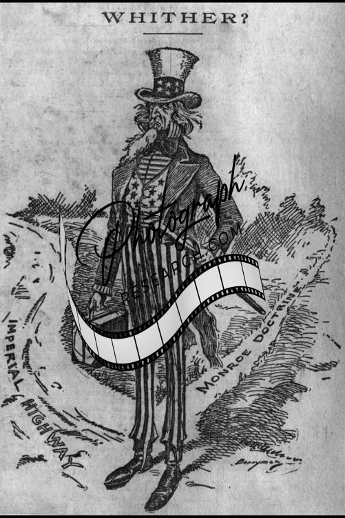 Summary: Uncle Sam at fork of 'Imperial Highway' & 'Monroe Doctrine'.