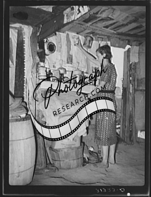 Title: Girl tending fire in shack home. Tin Town, Caruthersville, Missouri