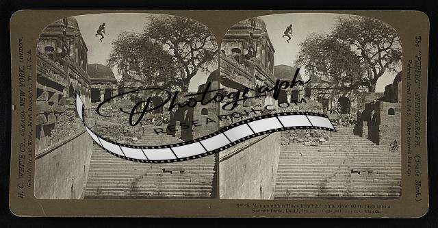 Mohammedan boys leaping from a tower 60 ft. high into a sacred tank,Delhi,India