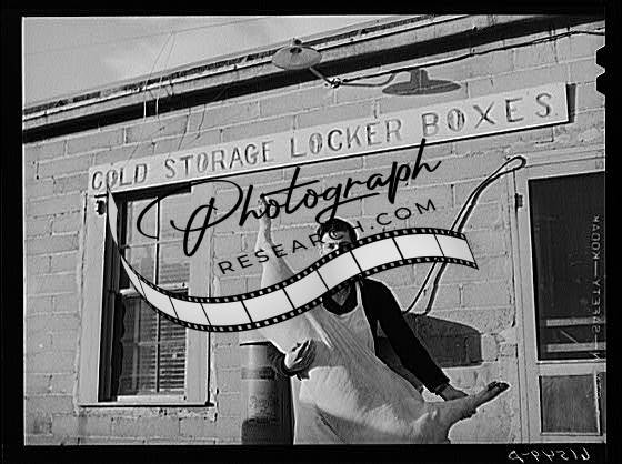 Title: Farmers bring their own butchered pigs to cold storage lockers. Next year butchering will be done there. This coop received a forty-five hundred dollar loan from FSA (Farm Security Administration). Casselton, North Dakota