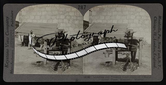 Grinding and pressing sugar cane by a horsepower press, Monterey [[Monterrey]], Me
