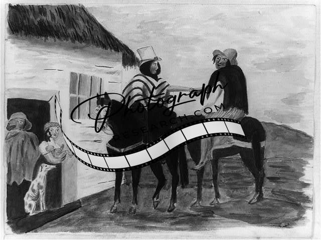 Two people,horseback,Colombian,house,family,dog,doorway,country life,c1850