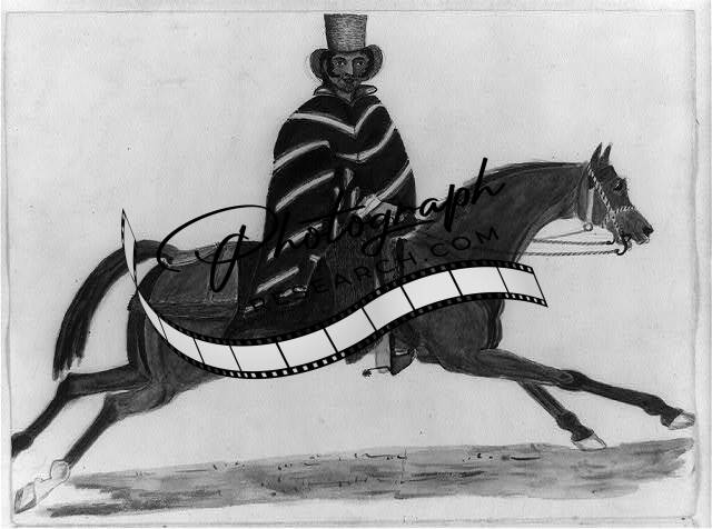 Man,possibly Colombian,wearing poncho,hat,riding horse,transportation,c1850