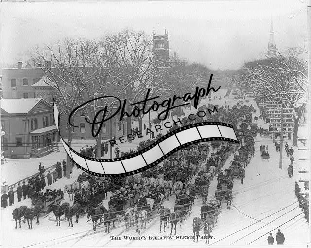 Worlds greatest sleigh party,Main Street of town filled with sleighs,people,1907