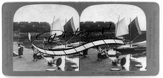 Cavite,Philippine Islands: A beach scene,c1902,US Naval Officers,cannons,boats