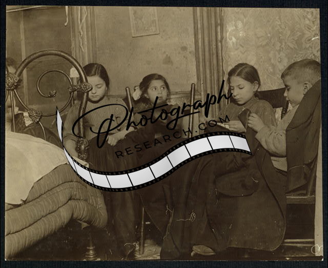Three girls,a boy working on garments,New York,NY,Tenement Housing,Lewis Hine