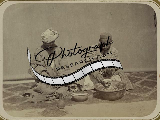 Summary: Photograph shows two male actors with faces painted and wearing artificial beards playing a game with small stones(?).