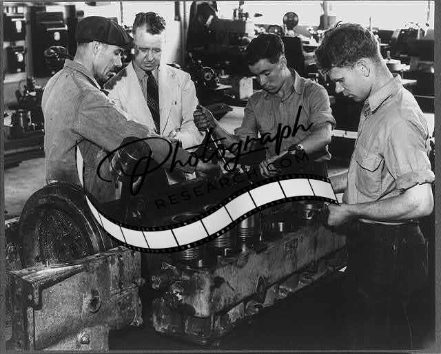 Title: Central Automotive Repair Shop, Salem, Virginia. July 27, 1940. E.E. Williams in charge of the electrical and fuel system department instructs Thomas L. Pulley of Victoria, Virginia in the method of undercutting an armature commutator on a steel turning lathe which is especially equipped for this electrical department